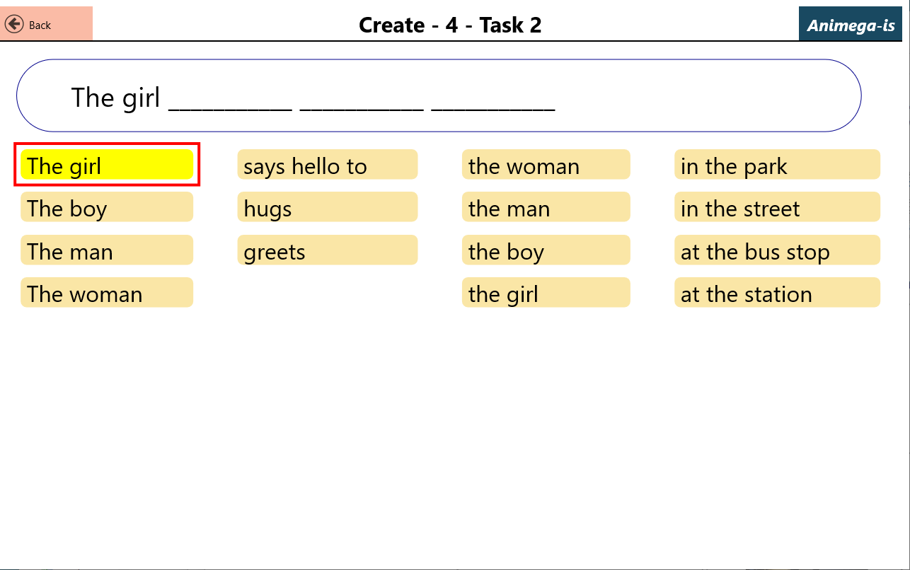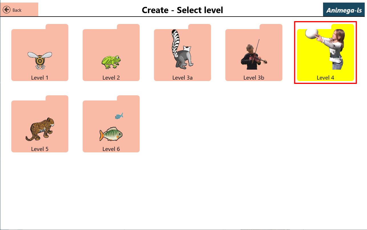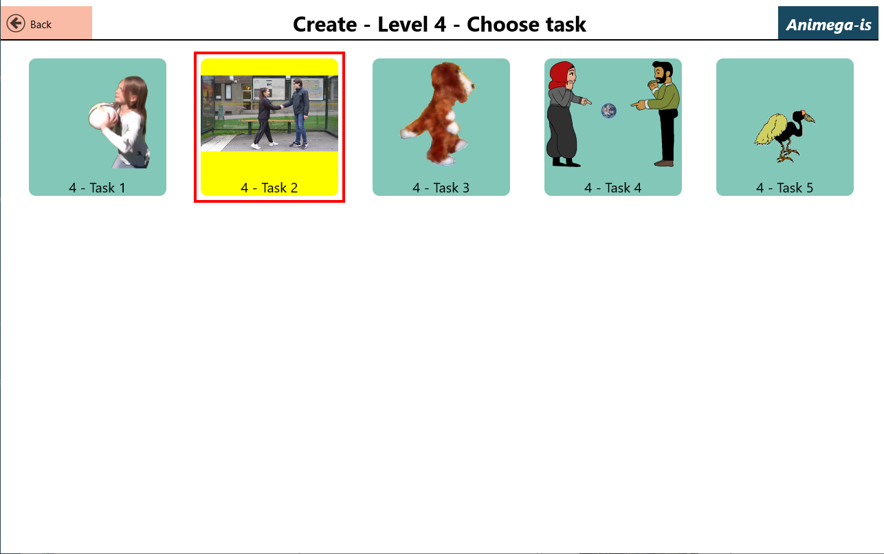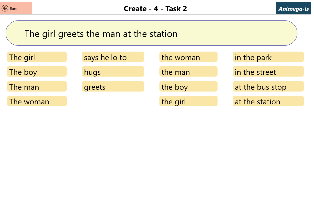 Animega-is consists of a total of 57 tasks (exercises) distributed over six levels. The exercises cover levels from single words, 2, 3, and 4 words, and up to longer multi-word sentences, and can produce close to 5000 possible sentences with corresponding animations or video clips.